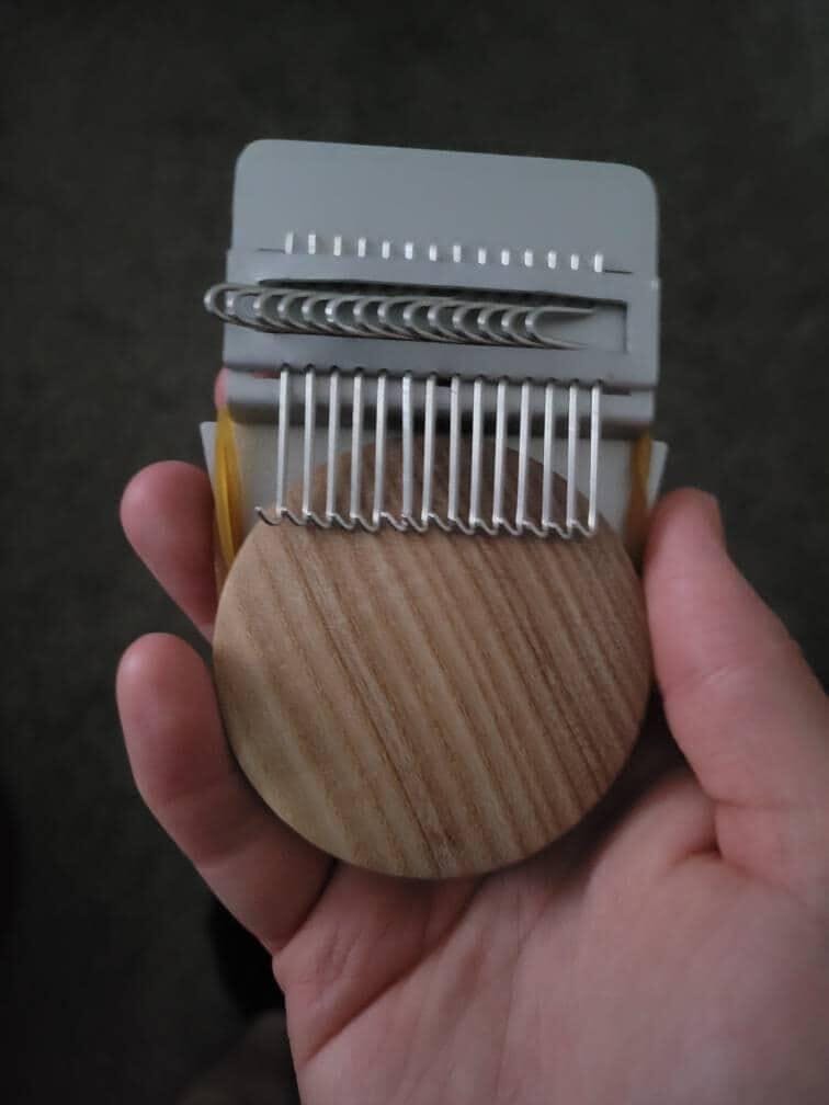 The device consists of two parts: a metal one with hooks and a wooden disc. The details are joined together with a strong elastic band. The device does an excellent job of repairing holes in clothes, you can create patterns in design. Supplied without storage box. (dimensions 3х4.3 inches; diameter wooden disck 64mm/2.5inch.). Supplied with a brochure showing the patterns for weaving and the finished result