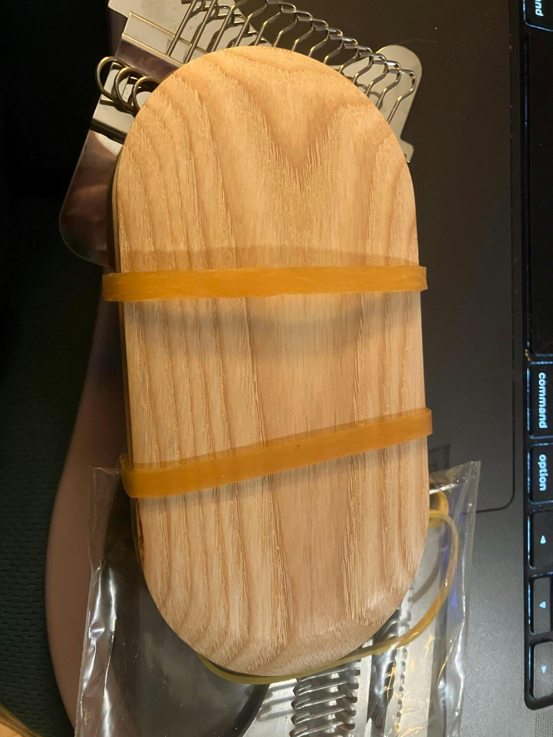 The platform is made of natural wood, for versions with 10 and 14 hooks. It is 13x6.5cm (5.1x2.5in). It comes with a reinforced rubber band for fixation.